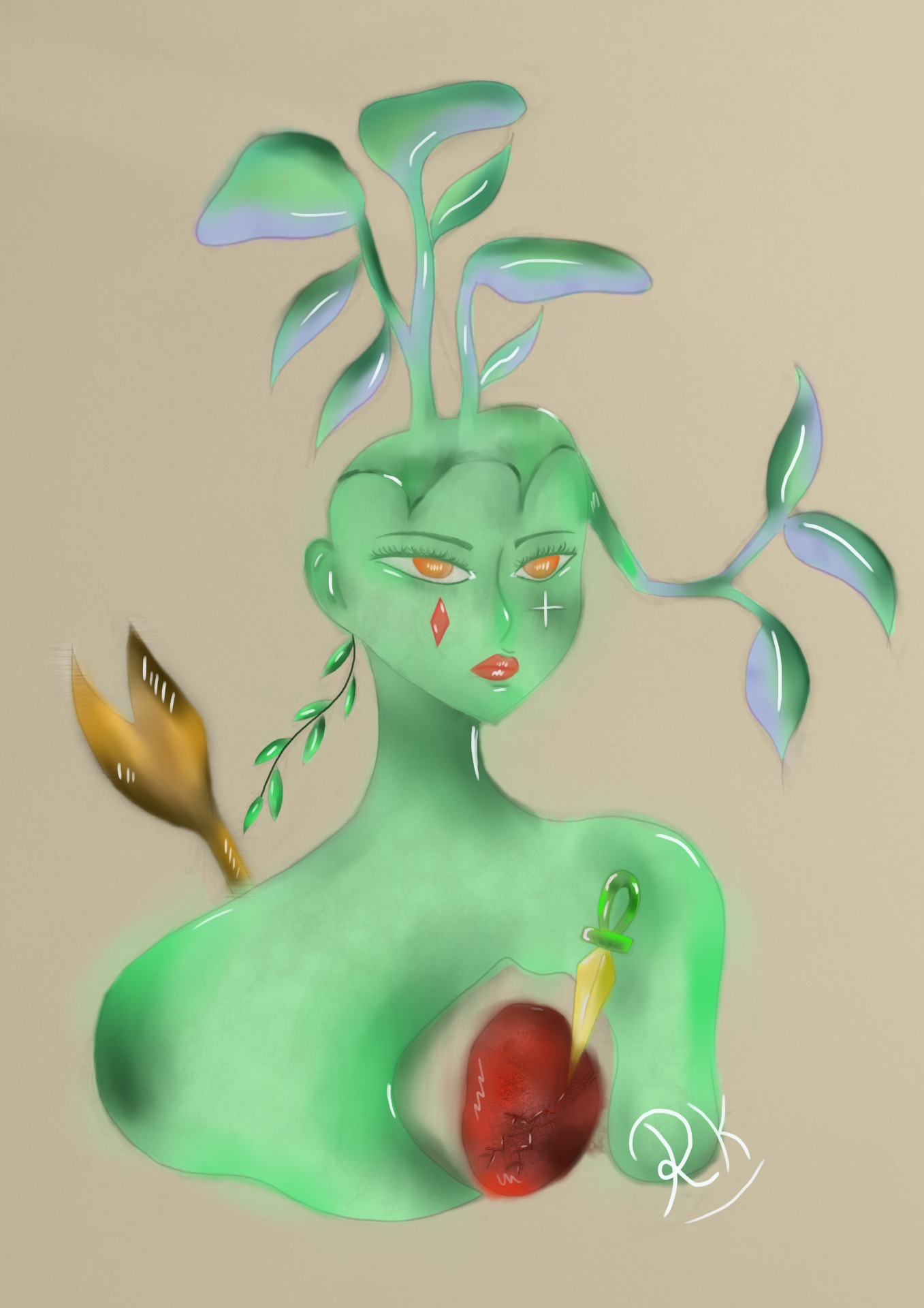 Elementos de Diseño y Simbolismo: Un elemento de color rojo intenso – un corazón en el pecho atravesado por un pequeño cuchillo verde con hoja dorada – contrasta poderosamente con el resto de la composición. Este símbolo genera un fuerte impacto emocional, evocando la dualidad entre la vulnerabilidad y la fuerza, la naturaleza y la violencia contenida. La expresión de la figura es enigmática, con ojos anaranjados y marcados por un destello blanco en forma de cruz en uno de ellos, y una lágrima roja en forma de diamante en la mejilla, lo cual aporta un toque dramático y profundo.