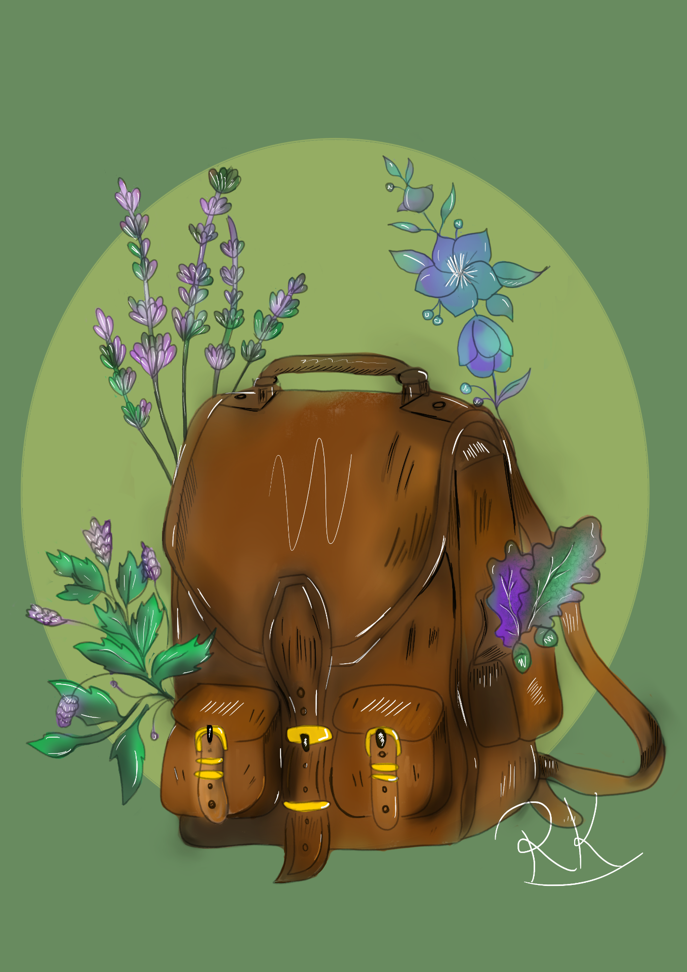 La paleta de colores empleada, que mezcla tonos terrosos con verdes y lilas, genera una sensación de paz y sencillez, mientras que el fondo circular en un verde suave ayuda a enmarcar y dar protagonismo a la mochila. Los detalles en las hojas y flores, junto con los reflejos en la mochila, muestran un excelente manejo de la luz y las sombras, lo cual le da volumen y realismo a la ilustración.