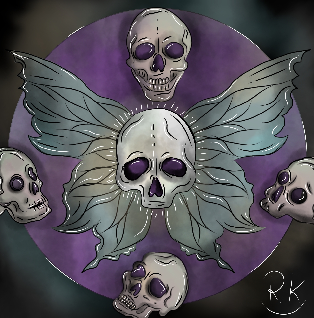 La figura central del cráneo, con alas estilizadas, se asemeja a una mariposa oscura o un insecto, dando la impresión de que la ansiedad se convierte en algo que intenta "volar" o escapar pero permanece atrapado en un círculo ineludible. Esta imagen recuerda a una mariposa nocturna, creando un simbolismo de algo oscuro y bello a la vez, pero asociado a sentimientos inquietantes.