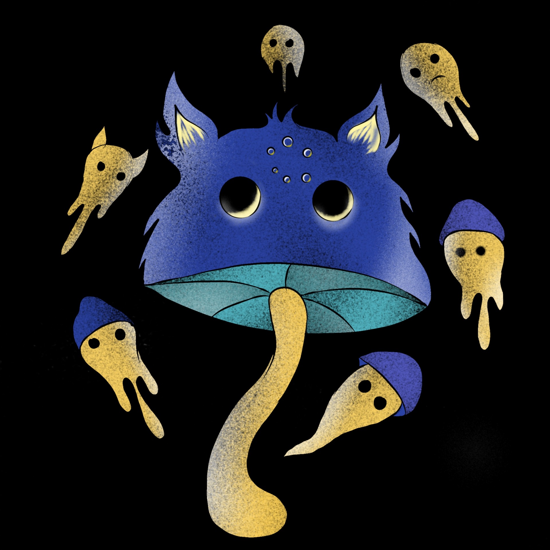 Fungiflora Boreal es una ilustración que transporta al espectador a un mundo de fantasía donde la naturaleza y lo sobrenatural se encuentran. La pieza está centrada en un hongo azul que posee rasgos antropomorfos, como grandes ojos oscuros y brillantes, y pequeñas orejas puntiagudas que le dan una apariencia de criatura mágica y solitaria. Este hongo central parece estar dotado de vida, y su expresión casi melancólica sugiere un personaje misterioso, como un guardián o habitante de un bosque encantado.