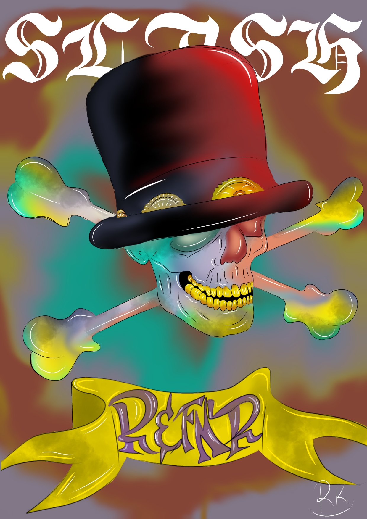Esta ilustración transmite un estilo vibrante y rebelde, inspirado en la icónica estética de Slash. La imagen muestra una calavera con una gran sonrisa dorada, usando un sombrero de copa oscuro y decorado con un par de huesos cruzados en el fondo, lo cual evoca una esencia rockera y atrevida. Los colores utilizados — tonos metálicos y brillantes, especialmente los verdes y amarillos intensos en los dientes y los huesos — le añaden un toque psicodélico y un contraste interesante.